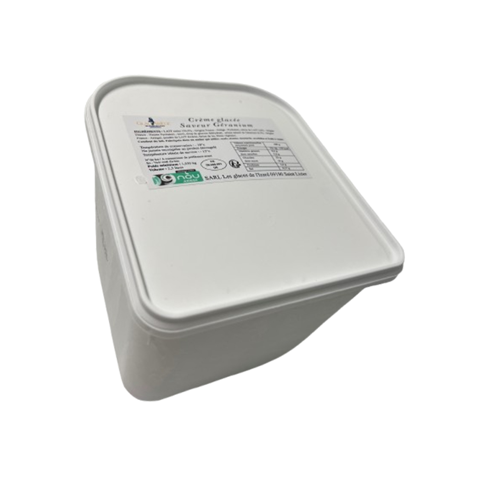 LAIT entier (56,5% – Origine France – Ariège – Pyrénées), crème de LAIT (16% – Origine France – Hautes Pyrénées), sucre, sirop de glucose déshydraté, arôme naturel de géranium (4,7% – origine France – Ariège), poudre de LAIT écrémé, farine de lin, fibres végétales.
